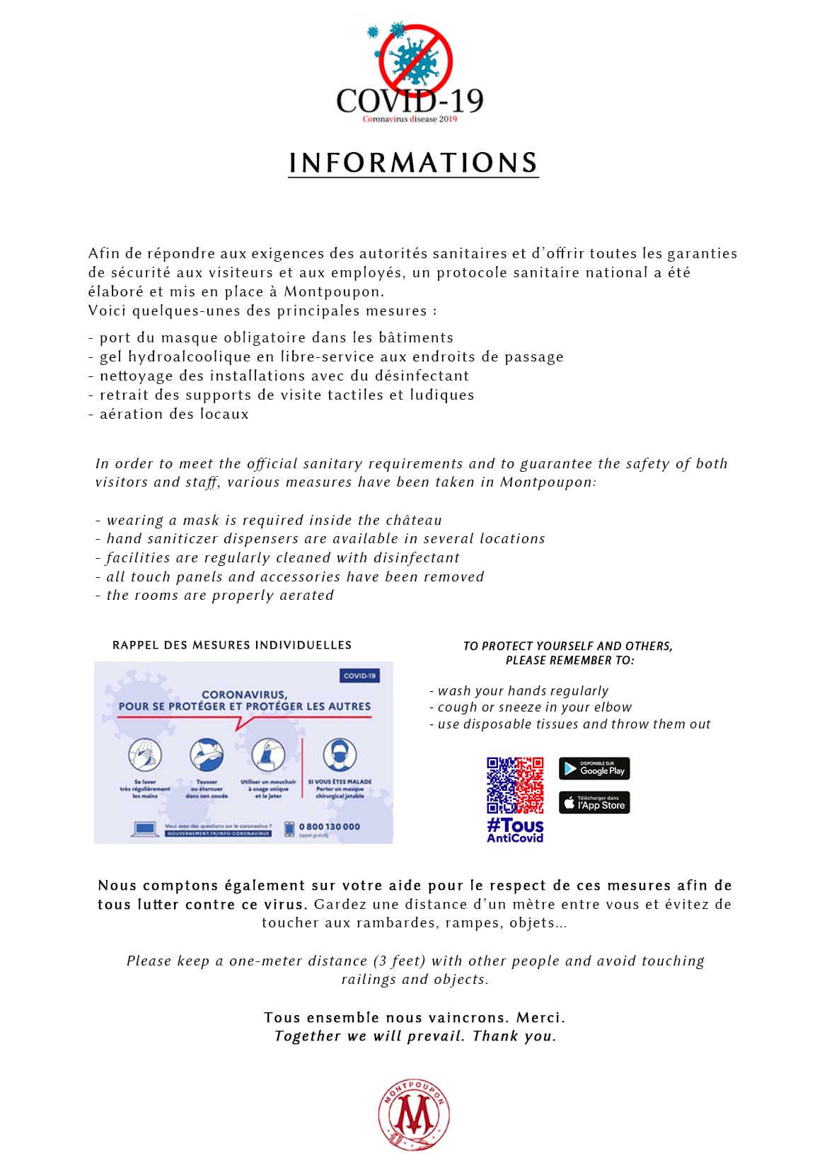 Nous comptons également sur votre aide pour le respect de ces mesures afin de lutter contre ce virus. Garder une distance d’un mètre entre vous et ne pas toucher aux rambardes, rampes, objets…