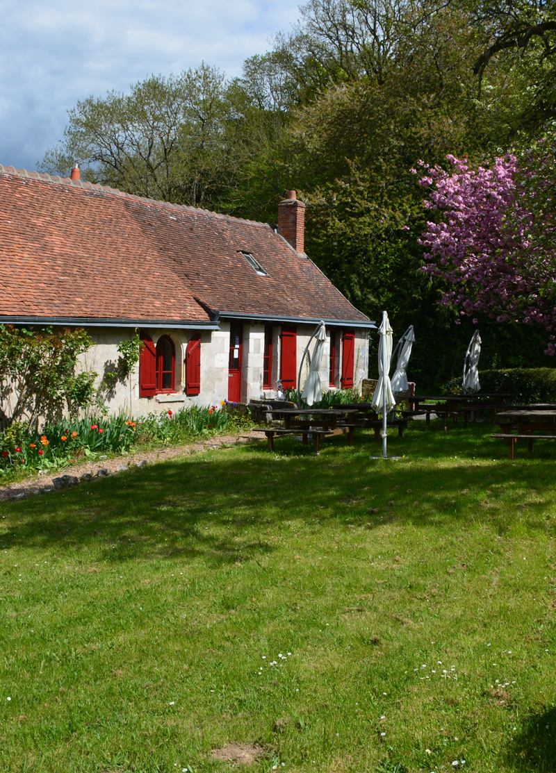 La terrasse ombragée devant l’ancien Moulin du Château de Montpoupon est idéale pour partager un repas en famille avec les enfants ou savourer un bon verre de vin de Touraine en dégustant des mets typiques de la région
