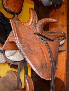 Photographie d’une selle d’Amazone. Le cuir de la selle d’Amazone est « frappé » pour créer des motifs en relief.