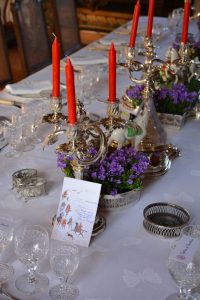 Photographie de la salle à manger du Château de Montpoupon présente des porcelaines de Nymphenburg illustrant la passion de la famille : la vènerie